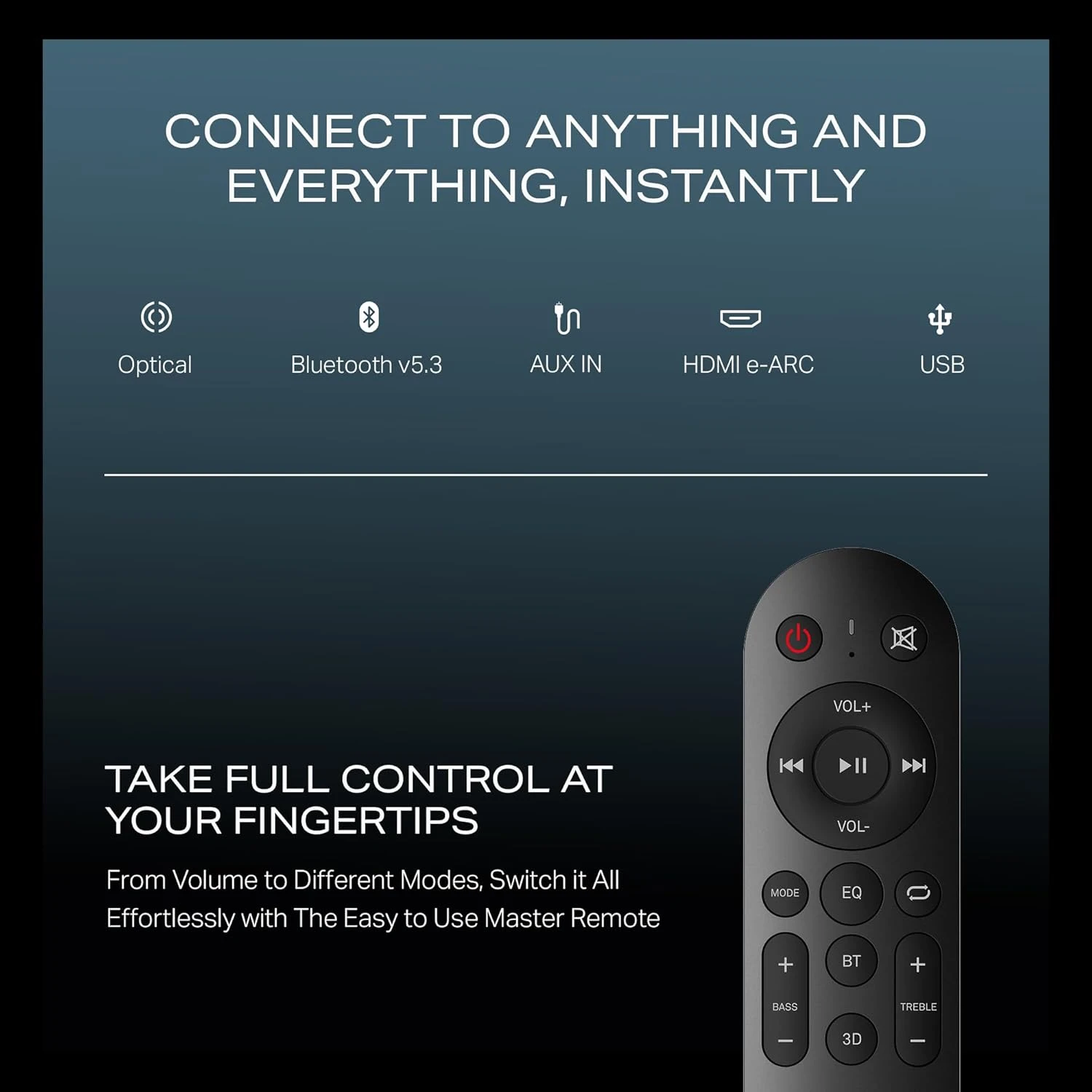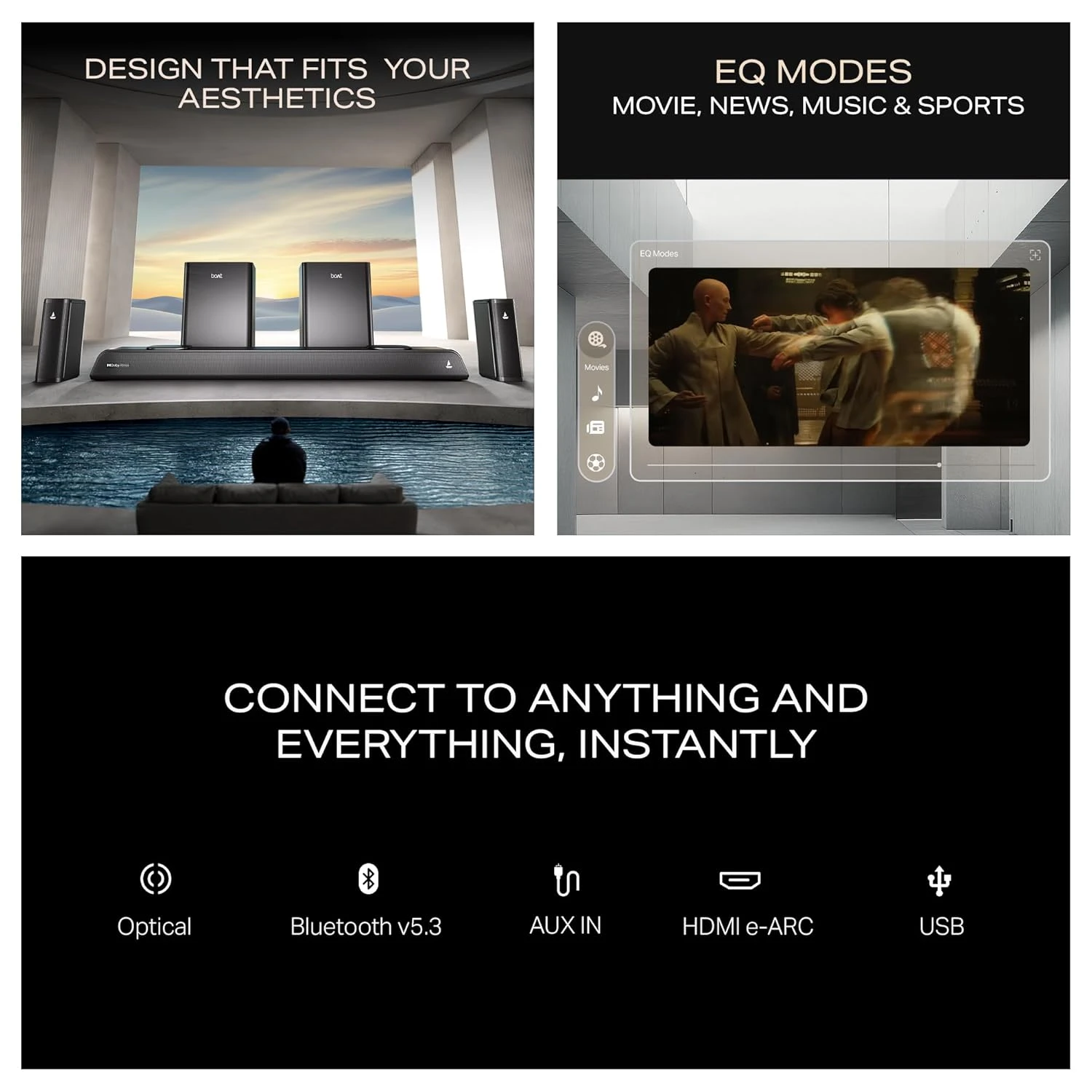 Enjoy powerful, room-filling sound with deep bass and crystal-clear audio, perfectly tuned with boAt Signature Sound for movies, gaming, music, and live sports.