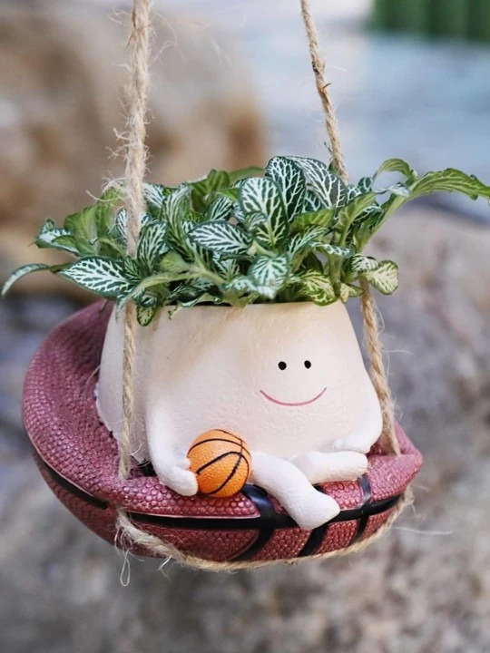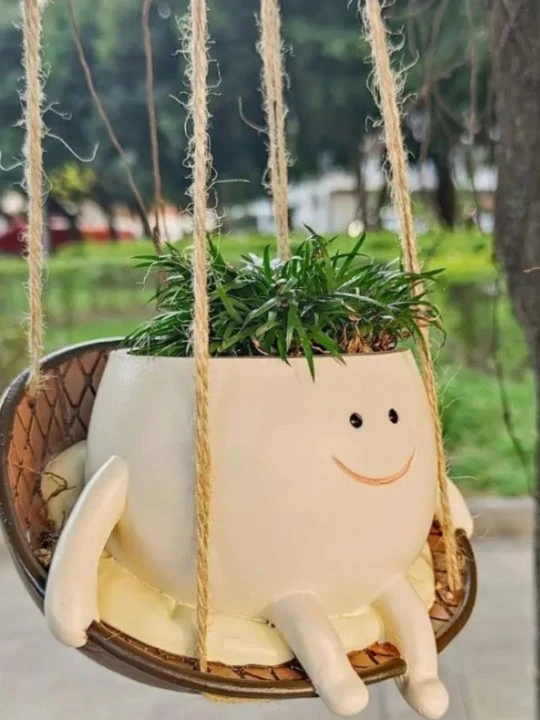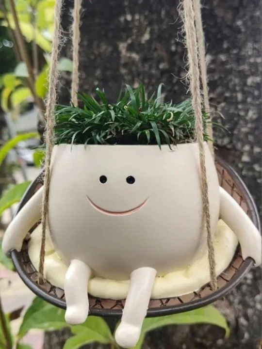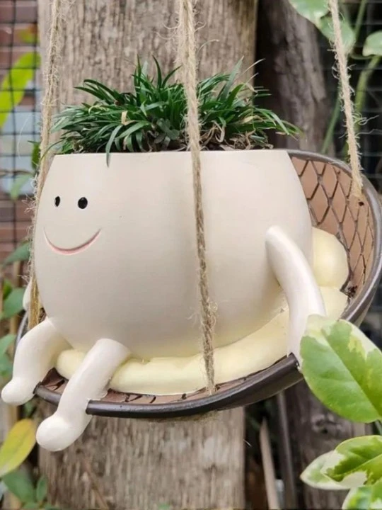 The planter features a cute face design sitting on a hanging swing, paired with a basket ball–style flower pot, making it a perfect décor piece for living rooms, balconies, gardens, windows, or study areas. It adds personality and warmth to both indoor and outdoor spaces.
