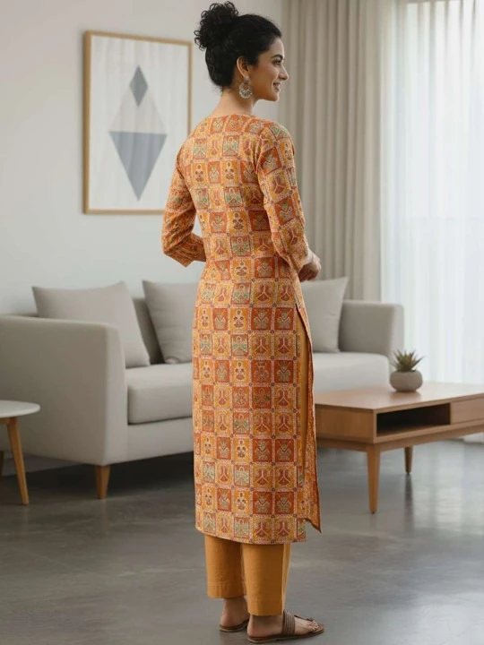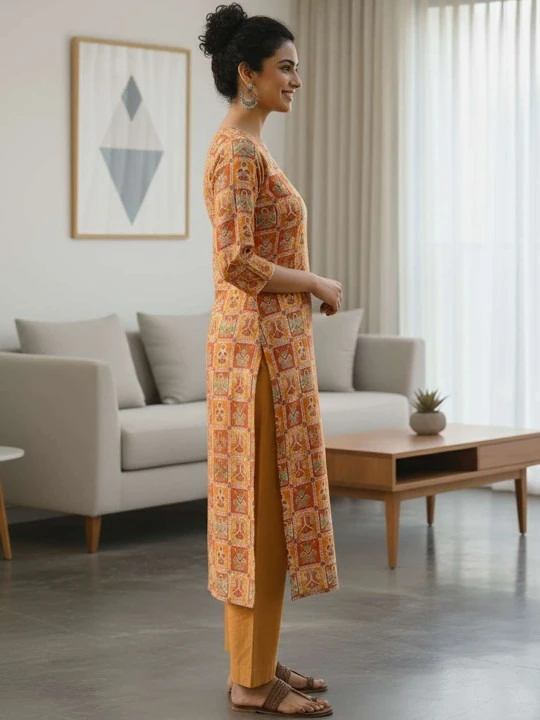 The beautiful ethnic motif prints give this kurti a traditional vibe, while the lightweight, breathable fabric keeps you comfortable all day long. Perfect for office wear, daily use, casual outings, or small festive occasions, this kurti pairs easily with jeans, leggings, palazzos, or ethnic bottoms.
