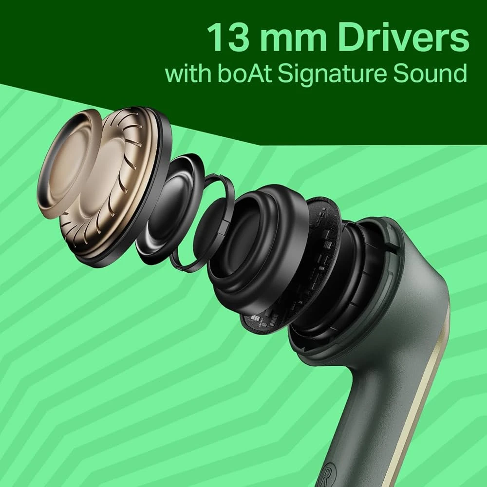 • Powerful 13mm Drivers: Tune into thumping bass-rich boAt Signature Sound from the dual 13 mm drivers. Experience every beat to the fullest!