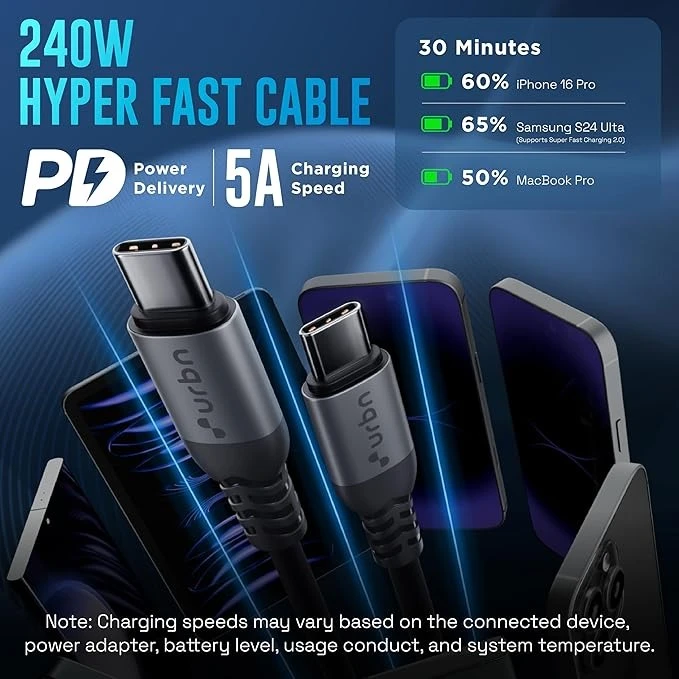 Power up all your USB-C devices faster and safer with the URBN Flex Cord 240W Type-C to C Fast Charging Cable. Designed for high-performance charging, this cable supports up to 240W output and 5A current, making it ideal for smartphones, tablets, laptops, and other USB-C compatible devices.